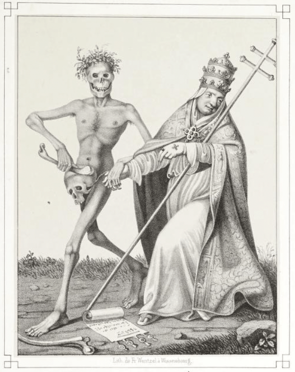Le danse des morts à Bâle. Lithographs by Matthaeus Merian. Attributed to Holbein, but glorious riffs on the same subject matter. I found it in the Internet Archive.
